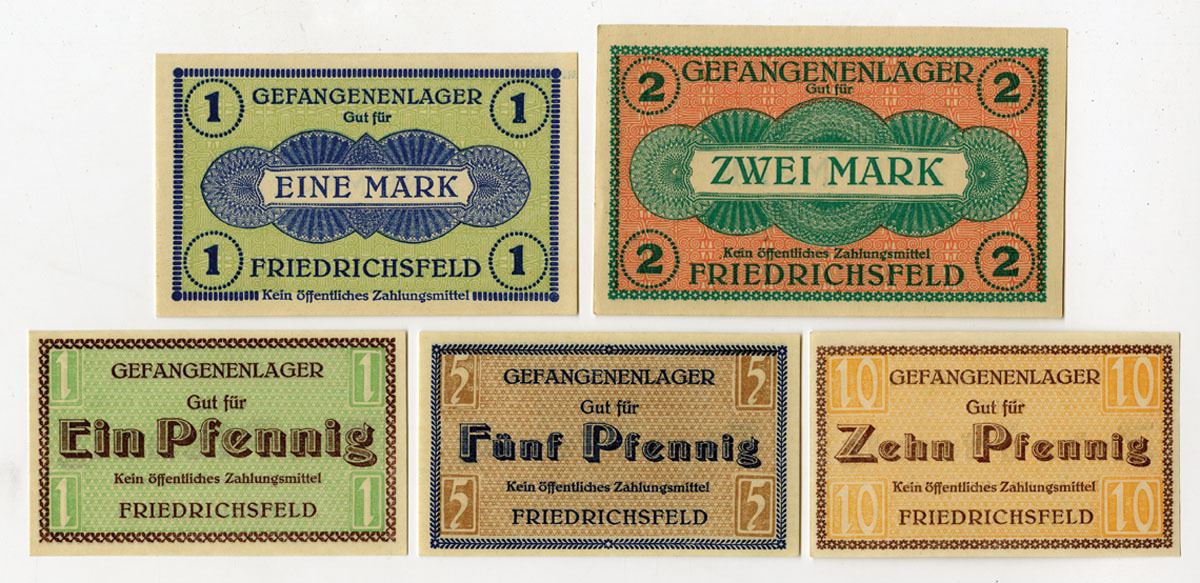 Friedrichsfeld, Germany, 1910-14. Lot of 5 Issued Notgeld Banknotes for use in the Friedrichsfeld Prisoner of War Camp, ranging from 1 Pfennig to 2 Mark. Notes range from XF to AU condition. (5). Sold "AS IS" no returns accepted.