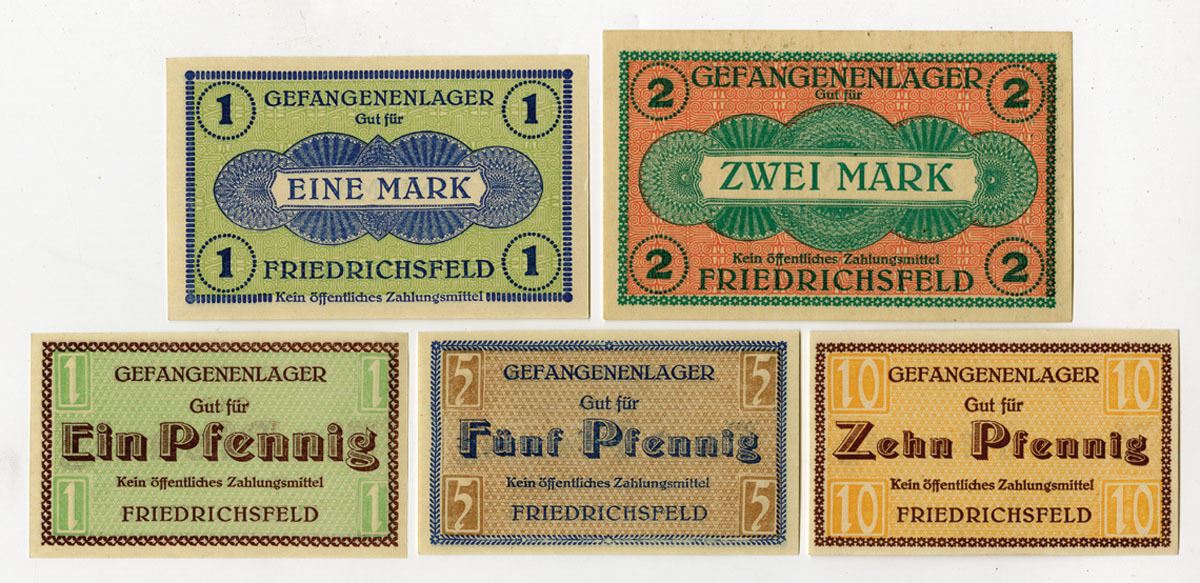 Friedrichsfeld, Germany, 1910-14. Lot of 5 Issued Notgeld Banknotes for use in the Friedrichsfeld Prisoner of War Camp, ranging from 1 Pfennig to 2 Mark. Notes range from XF to AU condition. (5). Sold "AS IS" no returns accepted.