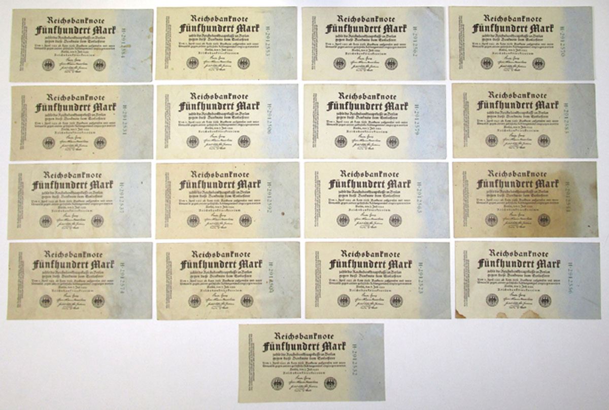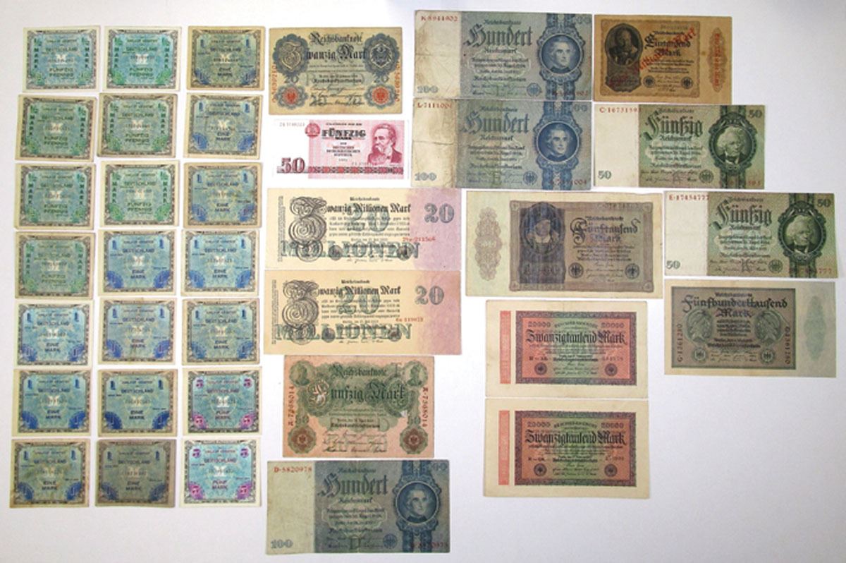Germany, 1910 to 1971. Lot of 53 Issued Banknotes, Includes: Reichsbanknote 1910, 50 Mar, P-41; 1914, 20 Mark, P-48b; 1922, 500 Mark, P-74b (17); 1922, 5000 Mark, P-78; 1923, 20,000 Mark, P-85a (2); 1923, 500,000 Mark, P-88b; 1923, 20 Millionen Mark, P-97b (2); ND (1923 Old Date 1922) 1 Milliarden Mark on 1000 Mark, P-113b; 1933 (1945), 50 Reichsmark, P-182a (2); 1935, 100 Reichsmark, P-183a (3); 1944, Allied Military Currency 1/2 Mark, P-191a (7); 1944, 1 Mark, P-192 (12); 1944, 5 Mark, P-193a (2); 1971, State Bank of Germany Democratic Republic 50 Mar, P-30a. Notes range from Fine to AU condition. (53). Sold "AS IS" no returns accepted.