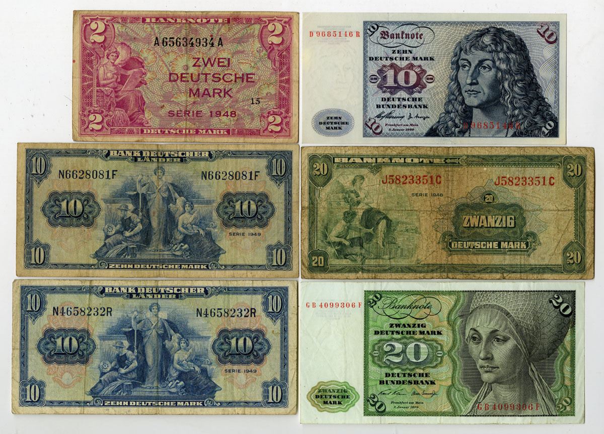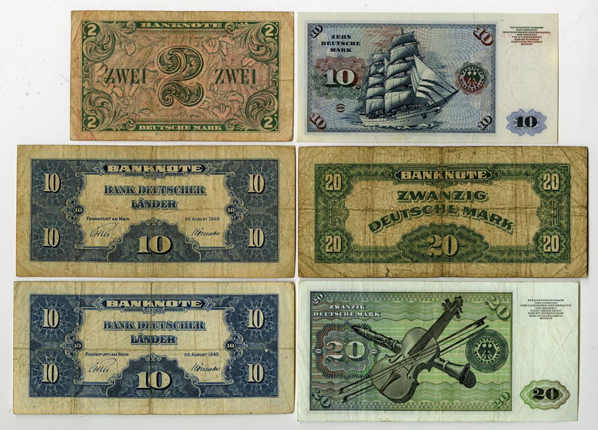Germany.., 1948 to 1970. Lot of 6 Issued Banknotes, Includes: 1948, German Federal Republic Allied Occupation-Post WWII 2 Deutsche Mark, P-3a, Tudor Press; 1948, 20 Deutsche Mark, P-6a, ABNC; 1949, 10 Deutsche Mark, P-16a (2), ABNC; 1960, Deutsche Bundesbank 10 Deutsche Mark, P- 19a; 1970, 20 Deutsche Mark, P-32a. Notes range from Fine to XF condition. (6). Sold "AS IS" no returns accepted.