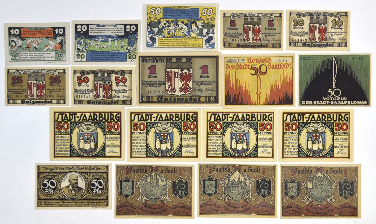 Germany, 1920-21. Lot of 18 Issued Notgeld, Includes examples from towns such as Bad Harzburg, Calzwedel, Saalfeld (Saale), and Saarburg, among others. Designs vary widely and feature civic coats of arms, town gates and architectural views, allegorical scenes, stylized graphic compositions, and decorative geometric borders typical of German municipal Notgeld issues of the early 1920s. Several notes display serial numbers, printed or manuscript signatures of municipal officials, and occasional accounting or issue markings. AU to CU condition. (18). Sold “AS IS” no returns accepted.