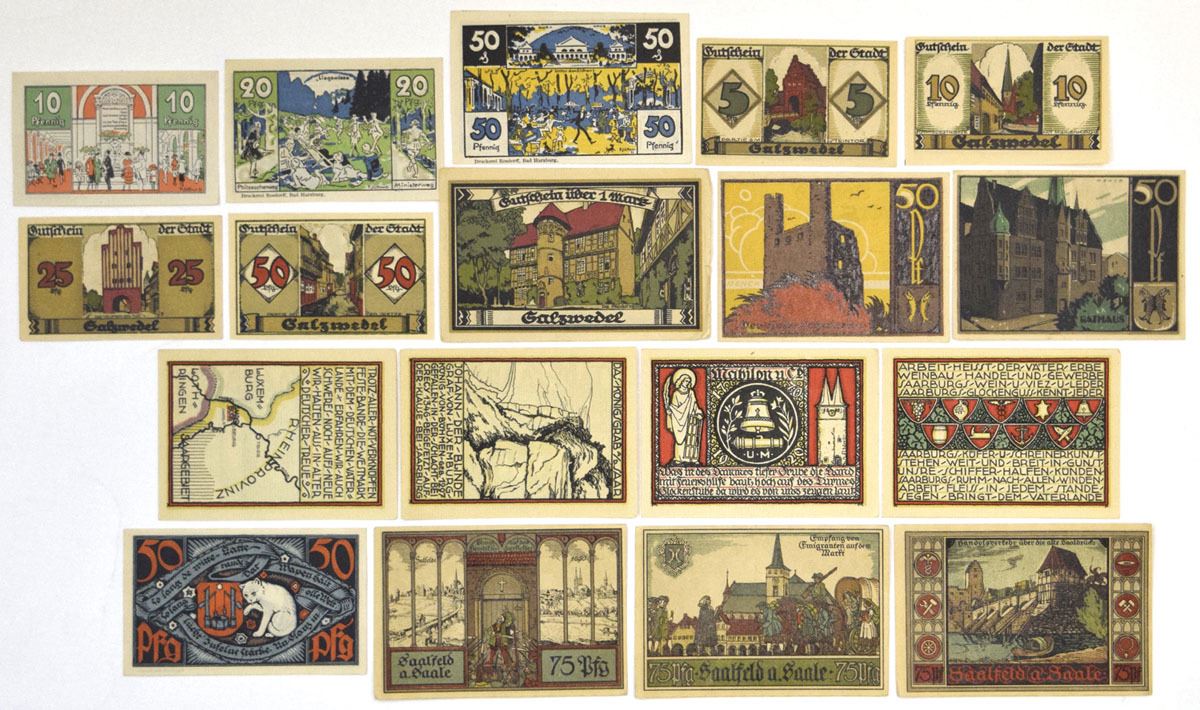 Germany, 1920-21. Lot of 18 Issued Notgeld, Includes examples from towns such as Bad Harzburg, Calzwedel, Saalfeld (Saale), and Saarburg, among others. Designs vary widely and feature civic coats of arms, town gates and architectural views, allegorical scenes, stylized graphic compositions, and decorative geometric borders typical of German municipal Notgeld issues of the early 1920s. Several notes display serial numbers, printed or manuscript signatures of municipal officials, and occasional accounting or issue markings. AU to CU condition. (18). Sold “AS IS” no returns accepted.