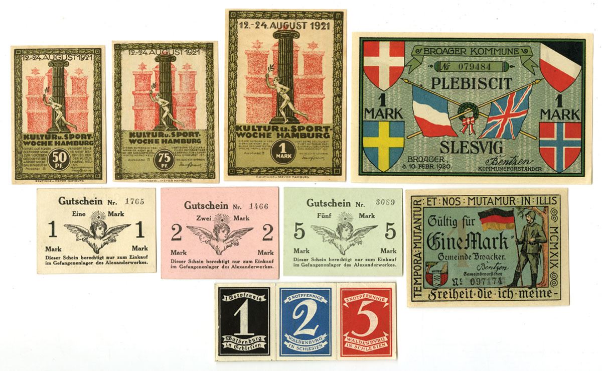 Germany, 1914-19. Lot of 11 Notgeld from Various Cities, Includes: Hamburg 50 Pfennig, 75 Pfennig, and 1 Mark; Municipality of Broacker, 1 Mark (2) with 2 different designs and sizes; Waldenburg, Uncut Sheet of 1,2, 5 Pfennig; Alexanderwerk Company, WWI POW 1 Mark, 2 Mark, and 5 Mark Vouchers. Notes range from VF to XF condition. (11). Sold "AS IS" no returns accepted.