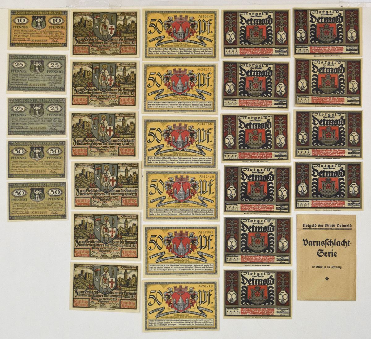 Germany. Lot of 27 German Notgeld notes, from Various Cities, Includes: Warburg (6); Neidenburg (5); Detmold (10); and Wittenberge (6). All are in Uncirculated or better condition. (27)