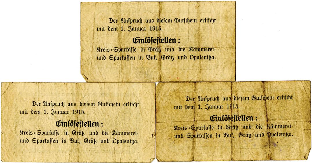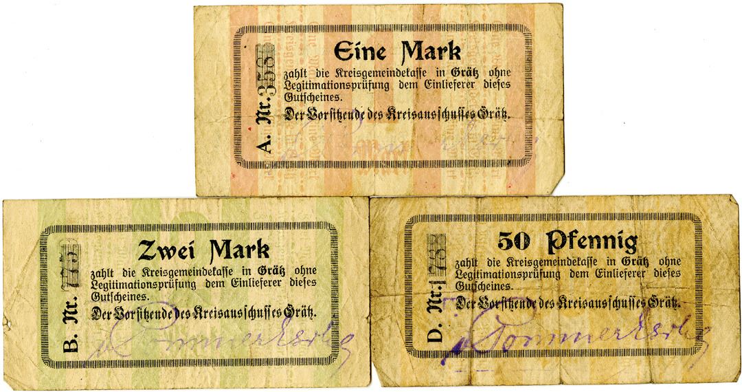 Germany, Gr_tz. Lot includes 50 Pfennig, 1, & 2 Mark. Bold watermark and light underprint colors on each. VF.