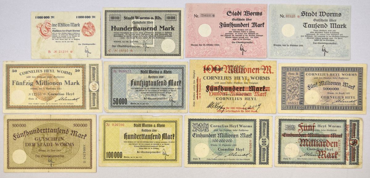 Germany, 1923. Group of 12 Issued Notgeld Banknotes from Worms, all are large denominations. Fine to VF condition. Sold "As Is" No Returns accepted. (12)