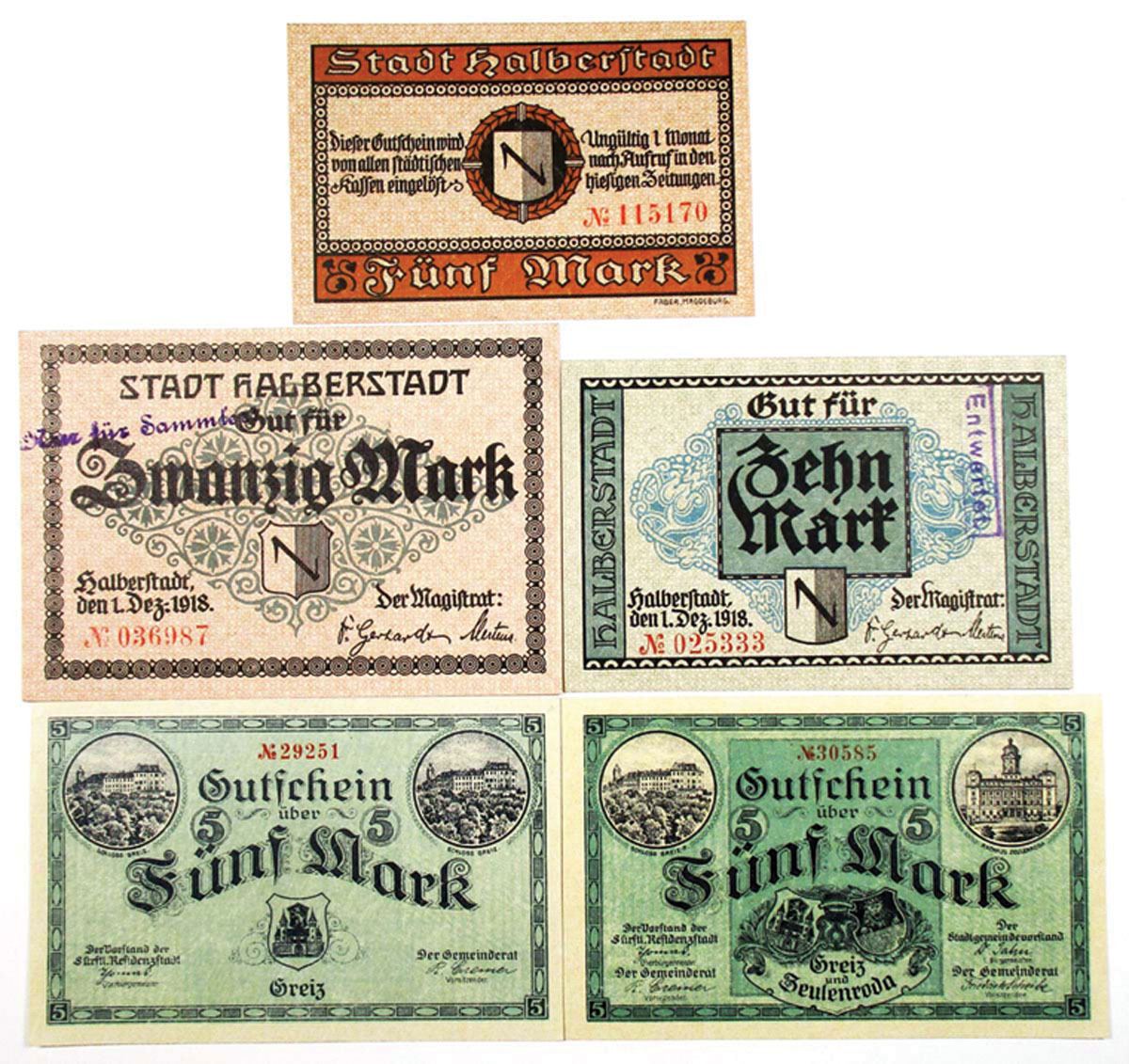 Germany. 1918, Lot 5 notes, includes Halberstadt, 5, 10, and 20 Mark Notgeld; and, Greiz, 2 different 5 Mark Notgeld. XF to AU. (5)