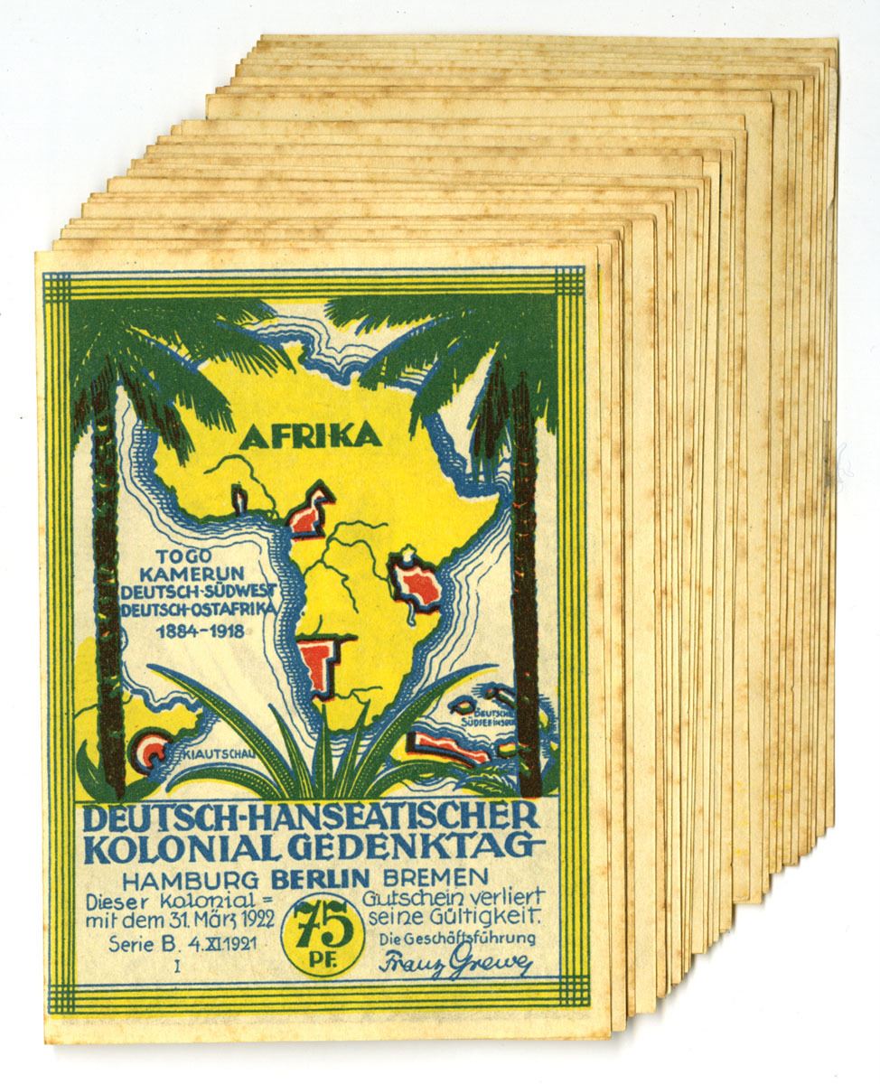 Germany, 1921. Lot of 6 sets of 5 notes each (30 notes) Includes 75 Pfennig Notgeld notes issued for the German Hanseatic Colonial Memorial Day held in Hamburg and Bremen. The series promotes remembrance of Germany’s former overseas colonies and features portraits of O. v. Bismarck, Dr. Carl Peters, H. von Wissmann, A. Lüderitz, and Carl Woermann, with the inscription “Remember our Colonies.” The colorful reverses display a map of Africa highlighting former German colonial territories including Togo, Cameroon, German East Africa, and German South West Africa. Printed in multicolor with tropical and botanical design elements. Includes 5 examples of each of the 5 notes in the series. Conditions range from VF to XF condition. (30). Sold “AS IS” no returns accepted.