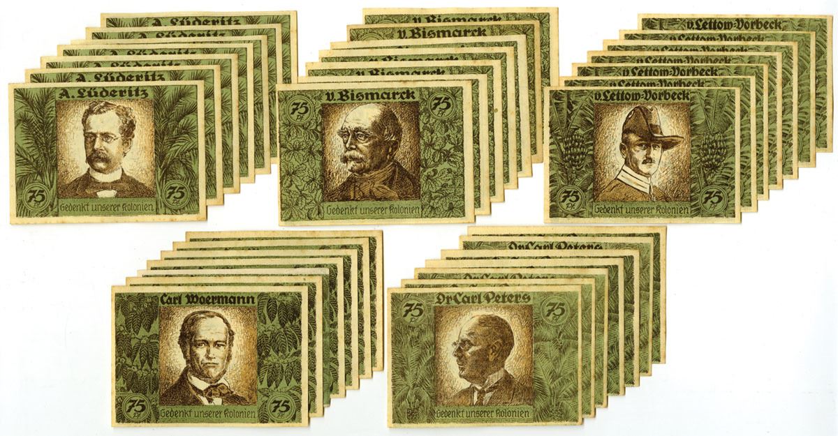 Germany, 1921. Lot of 6 sets of 5 notes each (30 notes) Includes 75 Pfennig Notgeld notes issued for the German Hanseatic Colonial Memorial Day held in Hamburg and Bremen. The series promotes remembrance of Germany’s former overseas colonies and features portraits of O. v. Bismarck, Dr. Carl Peters, H. von Wissmann, A. Lüderitz, and Carl Woermann, with the inscription “Remember our Colonies.” The colorful reverses display a map of Africa highlighting former German colonial territories including Togo, Cameroon, German East Africa, and German South West Africa. Printed in multicolor with tropical and botanical design elements. Includes 5 examples of each of the 5 notes in the series. Conditions range from VF to XF condition. (30). Sold “AS IS” no returns accepted.