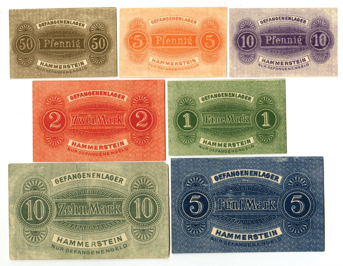 Germany. ND (1915-18). Lot of 7 Notgeld notes from POW Camp, Hammerstein, Notes range from 5 Pfennig to 10 Mark, Each note is a different color and size, Notes range from VF+ to AU condition. (7). Sold "AS IS" no returns accepted.