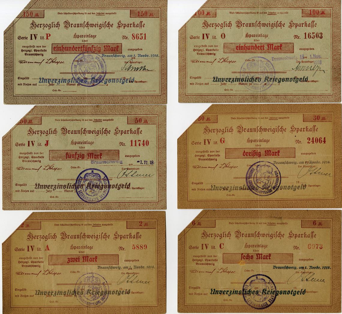 Braunschweig, Germany, 1918. Braunschweig City Treasury Lot of 6 I/C Emergency War Notes, Includes: 2 Mark, 6 Mark, 30 Mark, 50 Mark, 100 Mark, & 150 Mark, All notes have validation handstamps at bottom center, Cut cancelled at top left corner, Fine to VF+ condition. (6). Sold "AS IS" no returns accepted. The Braunschweigische Staatsbank was founded by Duke Karl I of Braunschweig-LŸneburg on March 9, 1765 as the Herzogliches Leyhaus , making it the first state bank on German soil.