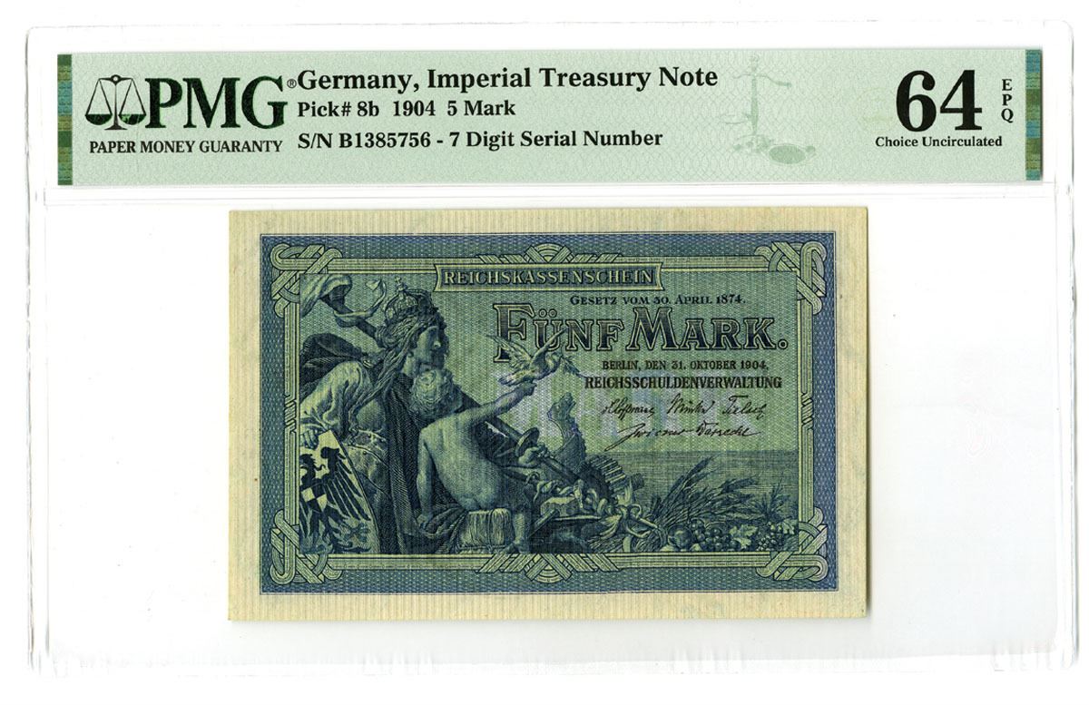 Germany, 1904. Blue and blue-green print with Germania and child with dove at left, Back is green and blue with dragon at center, S/N B1385759, PMG graded Choice Uncirculated 64 EPQ.
