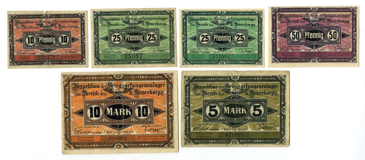 Berlin, Germany, 1917. Lot of 6 Issued Notgeld notes from the Inspection of Prisoner of War Camps of the III Army Corps, Includes: 10 Pfennig; 25 Pfennig (2); 50 Pfennig; 5 Mark; 10 Mark. Notes feature ornate designs with bold central denomination panels, decorative borders, printed signatures of camp officials, and individual serial numbers. Issued for controlled circulation within German POW camps during World War I, where special camp currency regulated prisoner transactions. Notes range from Fine to Vf+ overall with strong color and detail. (6). Sold “AS IS” no returns accepted.