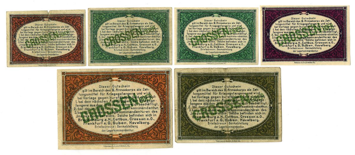 Berlin, Germany, 1917. Lot of 6 Issued Notgeld notes from the Inspection of Prisoner of War Camps of the III Army Corps, Includes: 10 Pfennig; 25 Pfennig (2); 50 Pfennig; 5 Mark; 10 Mark. Notes feature ornate designs with bold central denomination panels, decorative borders, printed signatures of camp officials, and individual serial numbers. Issued for controlled circulation within German POW camps during World War I, where special camp currency regulated prisoner transactions. Notes range from Fine to Vf+ overall with strong color and detail. (6). Sold “AS IS” no returns accepted.