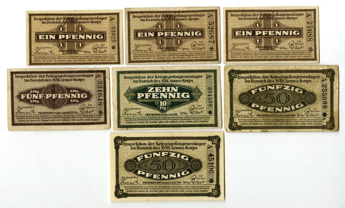 Frankfurt am Main, Germany, 1917. Lot of 7 Issued Notgeld notes from the Inspection of Prisoner of War Camps of the XVIII Army Corps. Includes: 1 Pfennig (3); 5 Pfennig; 10 Pfennig; 50 Pfennig (2). Notes feature ornate designs with bold central denomination panels, decorative borders, printed signatures of camp officials, and individual serial numbers. Several examples display small punch holes at the top as issued for accounting or cancellation purposes. These notes were issued for controlled circulation within German POW camps during World War I, where special camp currency regulated prisoner transactions. Notes range from VF to XF overall with strong color and detail. (7). Sold “AS IS” no returns accepted.