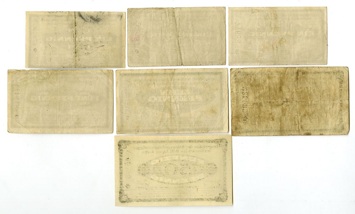 Frankfurt am Main, Germany, 1917. Lot of 7 Issued Notgeld notes from the Inspection of Prisoner of War Camps of the XVIII Army Corps. Includes: 1 Pfennig (3); 5 Pfennig; 10 Pfennig; 50 Pfennig (2). Notes feature ornate designs with bold central denomination panels, decorative borders, printed signatures of camp officials, and individual serial numbers. Several examples display small punch holes at the top as issued for accounting or cancellation purposes. These notes were issued for controlled circulation within German POW camps during World War I, where special camp currency regulated prisoner transactions. Notes range from VF to XF overall with strong color and detail. (7). Sold “AS IS” no returns accepted.