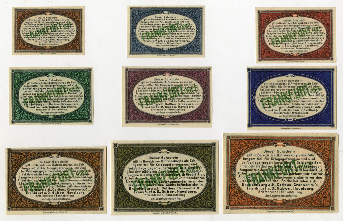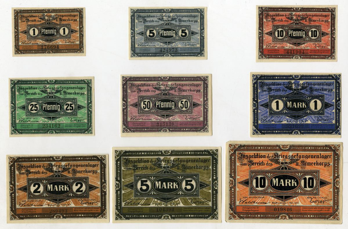 Frankfurt, Germany, 1918. Lot of 9 Banknotes ranging from 1 Pfennig to 10 Mark, Each note is a different and size, All are stamped with "Frankfurt Order" on back and range from XF to AU condition. (9). Sold "AS IS" no returns accepted.