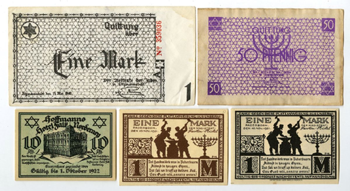 Germany, 1921-40. Lot of 5 Notgeld all with Judaic Images, Includes: 1921, 1 Mark (2) Issued Pair from Paderborn with a menorah on the reverse; 1922, 10 Pfennig Notgeld used at the Hoffmanns Hotel on the North Sea resort island of Nordeney, Note pictures the hotel at center with two Stars of David in opposite corners and a promotional poem on reverse; and reproduction 1940, 50 Pfennig and 1 Mark Litzmannstadt (Lodz Ghetto) Notgeld, Notes depict menorah on the obverse. Notes range from Fine to AU condition. (5). Sold "AS IS" no returns accepted.