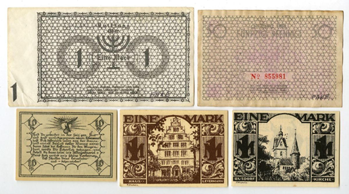 Germany, 1921-40. Lot of 5 Notgeld all with Judaic Images, Includes: 1921, 1 Mark (2) Issued Pair from Paderborn with a menorah on the reverse; 1922, 10 Pfennig Notgeld used at the Hoffmanns Hotel on the North Sea resort island of Nordeney, Note pictures the hotel at center with two Stars of David in opposite corners and a promotional poem on reverse; and reproduction 1940, 50 Pfennig and 1 Mark Litzmannstadt (Lodz Ghetto) Notgeld, Notes depict menorah on the obverse. Notes range from Fine to AU condition. (5). Sold "AS IS" no returns accepted.