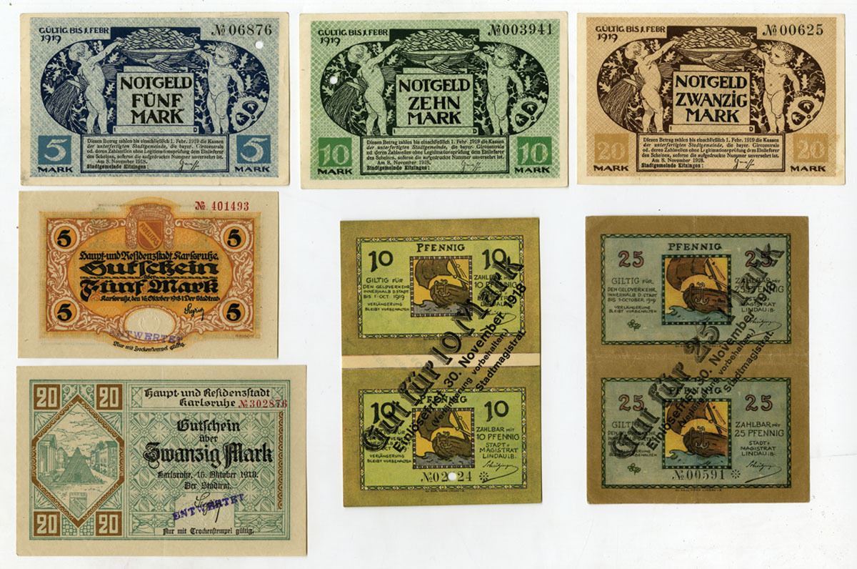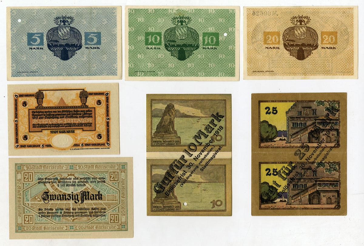 Germany, 1918-19. Lot of 7 Issued Notgeld, Includes: Kitzingen 5 Mark, 10 Mark, and 20 Mark; Karlsruhe 5 Mark and 20 Mark; Lindau 10 Mark and 25 Mark. Notes range from XF to AU condition. (7).
