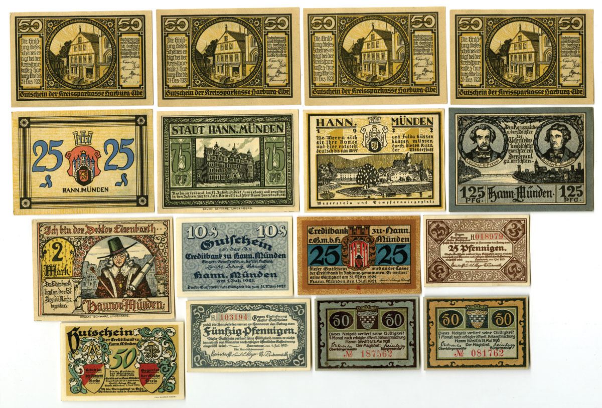 Germany, 1919-22. Lot of 16 Issued Notgeld, Includes examples from towns such as Hann. Münden and Harburg-Elbe, among others. Designs vary widely and feature civic buildings, architectural views, town scenes, churches, river landscapes, allegorical and folkloric figures, and decorative geometric borders typical of German municipal Notgeld issues of the early 1920s. Several notes display serial numbers, printed or manuscript signatures of issuing officials, and occasional bank or municipal issuer inscriptions. All are in Uncirculated to CU condition. (16). Sold “AS IS” no returns accepted.