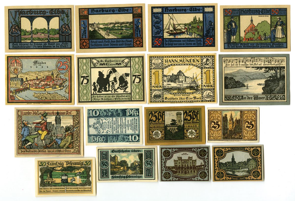 Germany, 1919-22. Lot of 16 Issued Notgeld, Includes examples from towns such as Hann. Münden and Harburg-Elbe, among others. Designs vary widely and feature civic buildings, architectural views, town scenes, churches, river landscapes, allegorical and folkloric figures, and decorative geometric borders typical of German municipal Notgeld issues of the early 1920s. Several notes display serial numbers, printed or manuscript signatures of issuing officials, and occasional bank or municipal issuer inscriptions. All are in Uncirculated to CU condition. (16). Sold “AS IS” no returns accepted.