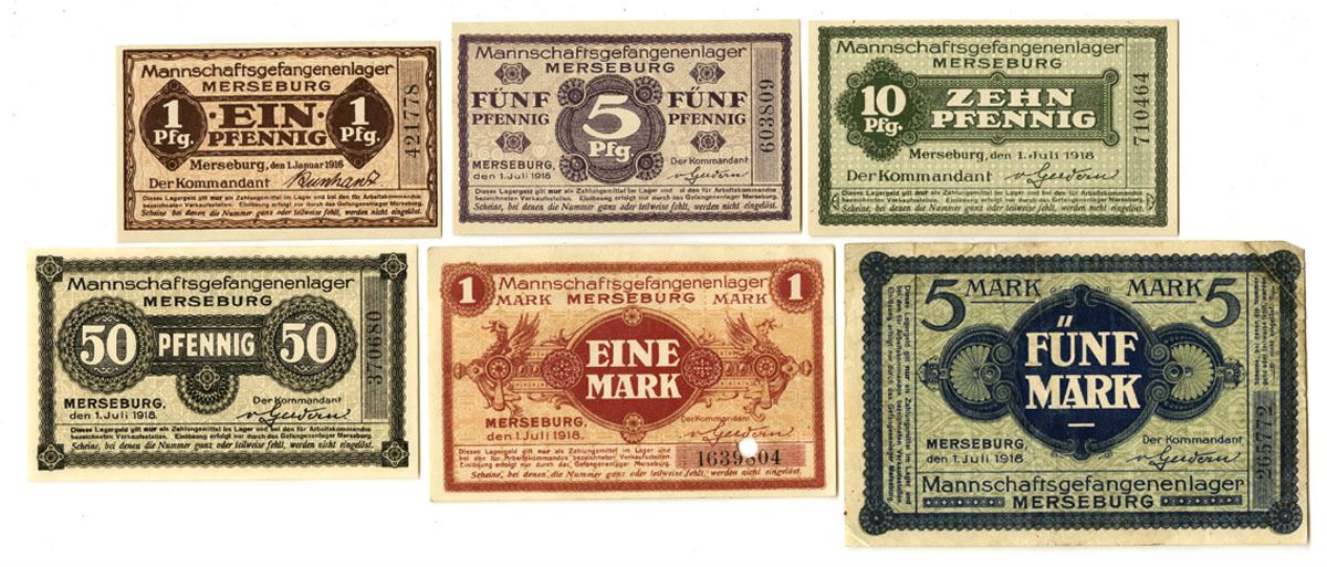 Merseburg, Germany, 1918. Lot of 6 Notgeld from Merseberg POW Camp, Notes range from 1 Pfennig to 5 Mark, Each note is a different color and size, Notes range from AU to UNC condition. (6). Sold "AS IS" no returns accepted.