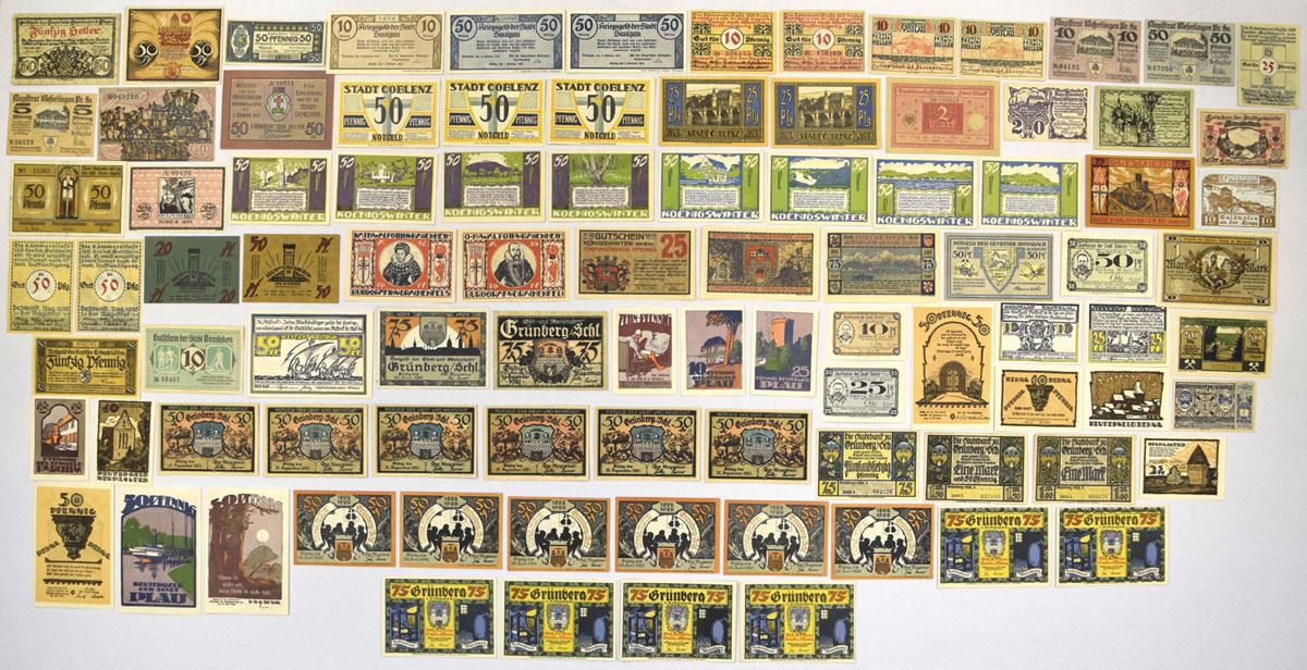Germany, 1917-23. Lot of 93 issued German Notgeld banknotes from the World War I and early inflation-era emergency currency period, includes notes from towns and cities such as Coblenz, Koenigswinter, Gruenberg in Schlesien, Detmold, Rossbach, Hildesheim, Burgdorf, Drachenfels, Plau, Reutlingen, Redina, and Voslau, among others, XF to CU condition. (93). Sold "AS IS" no returns accepted.