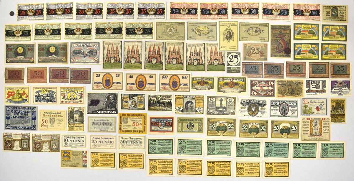Germany, 1917-23. Lot of 98 issued German Notgeld banknotes from the World War I and early inflation-era emergency currency period, representing a wide range of municipal and local issues. The group includes notes from towns such as Münster, Weimar, Aschaffenburg, Lauingen, Landshut, Lichtenhall, and Coblenz, among others. Numerous town issues and design varieties are represented throughout the group. Condition ranges from VF to CU with typical folds and handling wear. (98). Sold “AS IS” no returns accepted.