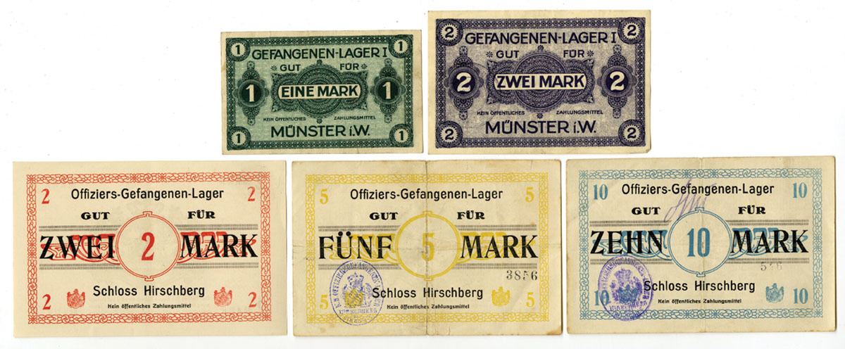 Germany, ND (1914-18). Lot of 5 Issued Notgeld used by POW camps in Munster and Schloss Hirschberg: 1 Mark and 2 Mark Notes used in Munster, both are different sizes and colors; 2 Mark, 5 Mark, and 10 Mark Notes used at Schloss Hirschberg (Castle was used as a POW camp for Officers), Notes are different colors, but the same sizes. Notgeld range from Fine to XF condition. (5). Sold "AS IS" no returns accepted.