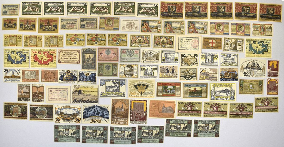 Germany, 1917-23. Lot of 89 issued German Notgeld banknotes from the World War I and early inflation-era emergency currency period, representing a wide range of municipal and local issues. The group includes notes from towns such as Münster, Weimar, Aschaffenburg, Lauingen, Landshut, Lichtenhall, and Coblenz, among others. Numerous town issues and design varieties are represented throughout the group. Condition ranges from VF to CU with typical folds and handling wear. (89). Sold “AS IS” no returns accepted.