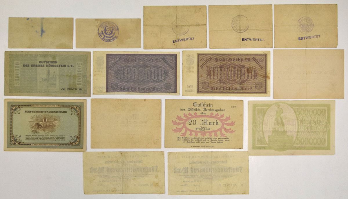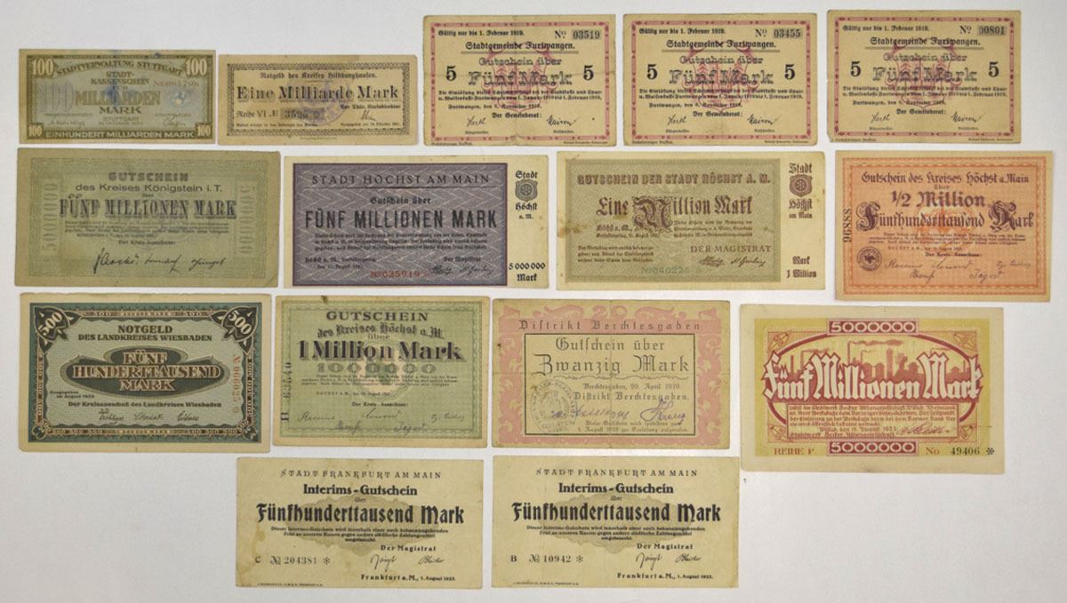 Germany. 1919-23. Lot of 15 Issued Notgeld from: Stuttgart, Hildburghausen Rural District, Furtwangen, Königstein, Höchst, Wiesbaden, and others. Notes range from XF to CU condition. (15). Sold "AS IS" no returns accepted.