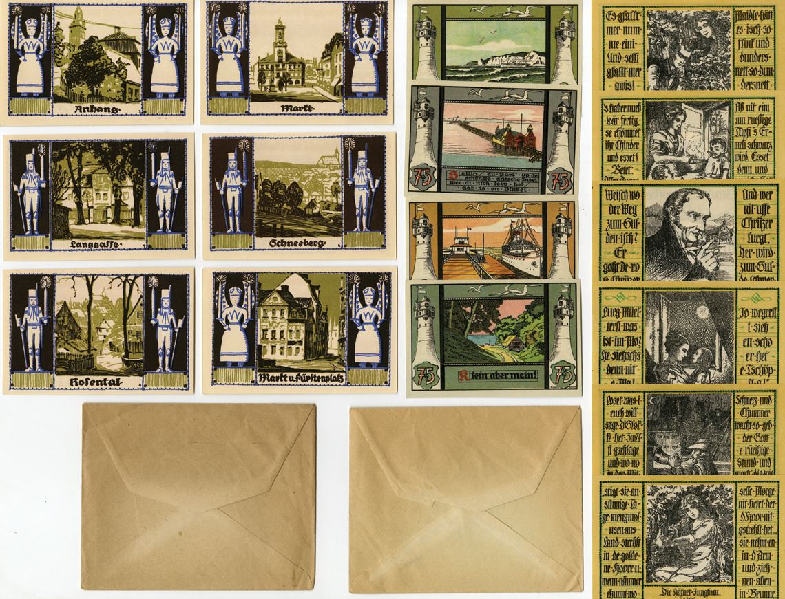 Germany, 1921-22. Lot of 16 Issued Notgeld From Various Cities: Schneeberg 50 Pfennig (6 each note has different illustration on reverse), Comes in original envelope with S/N 6409; Sellin a. Rugen 75 Pfennig (4 each note has a different illustration on the reverse), Comes in original envelope with S/N 6394; Schopfheim 50 Pfennig (6 each note has a different illustration on the reverse). Notes are in Uncirculated condition. (16). Sold "AS IS" no returns accepted.