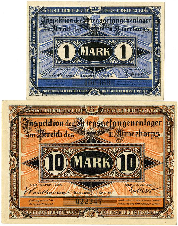 Berlin, Germany. Bereich. Lot of 2 notes, includes 10 Mark and 1 Mark, from the War Camp money series of the 3rd Armed Corps. Stamped "FRANKFURT ODER" on the back. About to Choice Uncirculated.
