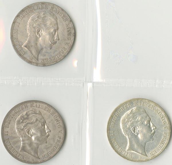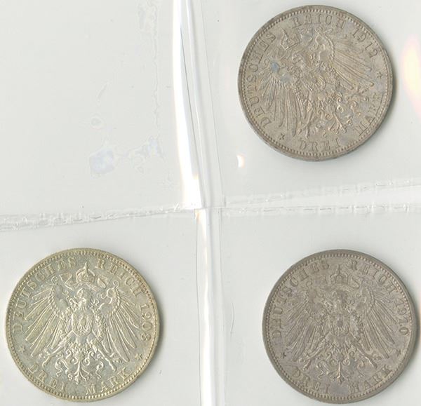 GermanyÉ.Lot of 3 coins, all are 3 Mark, KM#527 coins with different dates, Includes 1908A; 1910A; and 1912A, all are 0.900 Silver, 0.4792 oz., Obv: Portrait facing right; Rev: Crowned Imperial Eagle with Shield on Breast. Choice VF to Choice XF condition with a gray iridescent color, one with spotting and discoloration. (3)
