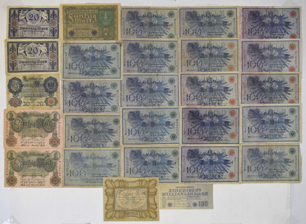 Germany, 1908-19. Lot of 25 Issued Banknotes, Includes: 1908, 100 Mark, P-33 (6); 1908 (1918-22); 100 Mark, P-34 (12); 1910, 50 Mark, P-41(2); 1914, 20 Mark, P-46b; 1915, 20 Mark, P-63 (2); 1918, 50 Mark, P-65; 1919, 50 Mark. P-66. Notes range from Fine to XF condition. (25). Sold "AS IS" no returns accepted.