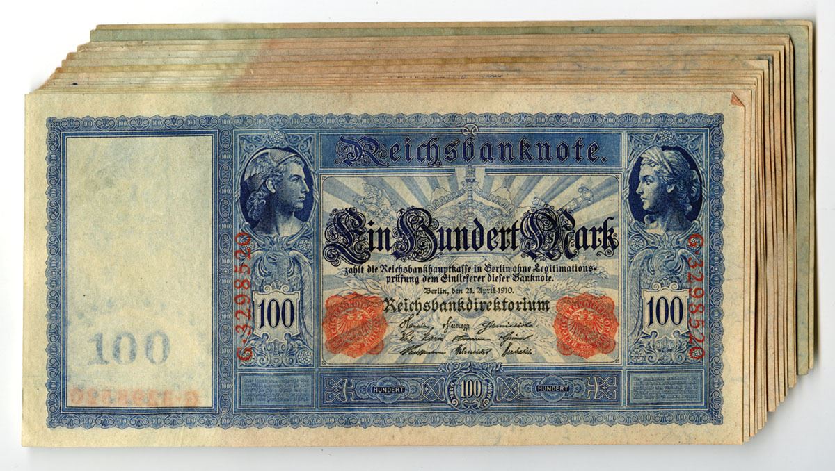 Germany....., 1910. 100 Mark, P-42 (15), Issued Banknote Assortment with some consecutive S/Ns, Dark blue on light blue-gray underprint, Mercury at left and Ceres at right in small circular frames, Red serial numbers vertical up right and left sides, Back is blue and red with Germania and sword at center, Notes are in XF to AU condition. (15). Sold "AS IS" no returns accepted.