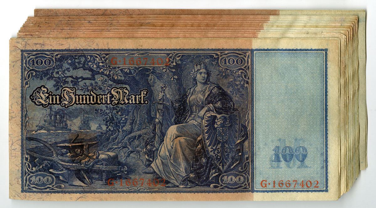 Germany....., 1910. 100 Mark, P-42 (15), Issued Banknote Assortment with some consecutive S/Ns, Dark blue on light blue-gray underprint, Mercury at left and Ceres at right in small circular frames, Red serial numbers vertical up right and left sides, Back is blue and red with Germania and sword at center, Notes are in XF to AU condition. (15). Sold "AS IS" no returns accepted.