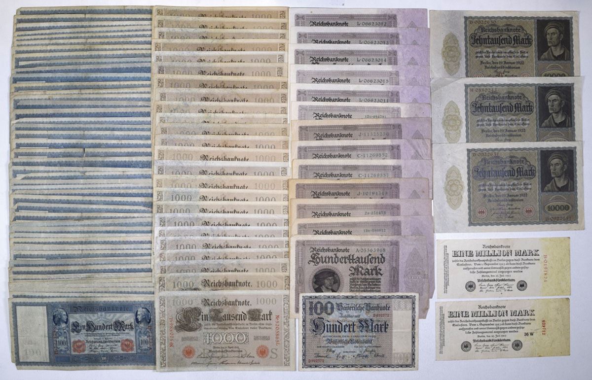 Germany, 1908-23. Lot of 96 Issued Banknotes, Includes: Reichsbanknote, 1908, 100 Mark, P-35 (53); 1910, 1000 Mark, P-44b (24); 1922, 10,000 Mark, P-70 (3); 1923, 100,000 Mark, P-83a (13); 1923, 1 Million Mark, P-94 (2); Bavarian Note Issuing Bank, 1922, 100 Mark, P-S923. (96). Sold "AS IS" no returns accepted.