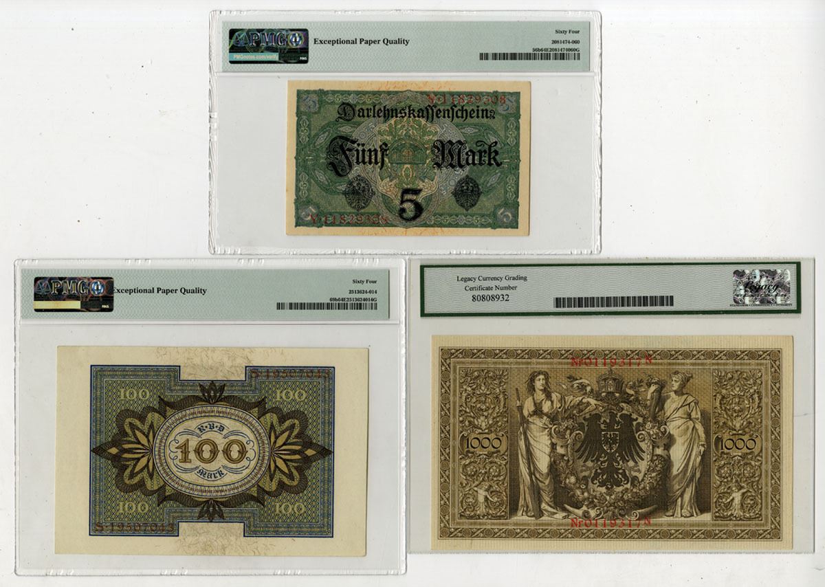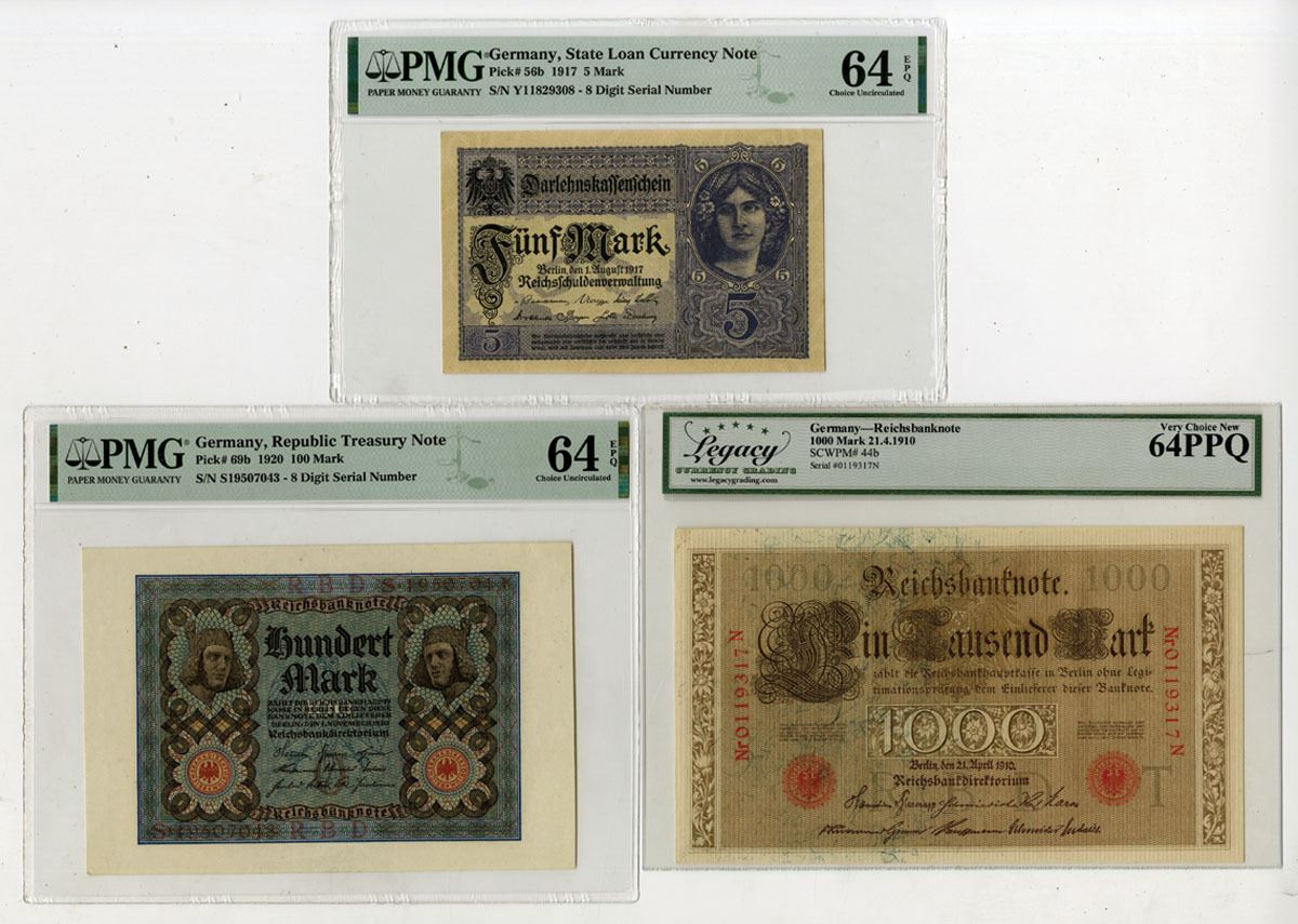 Germany, 1910-20. Lot of 3 Issued Banknotes, Includes: Reichsbanknote 1000 Mark, P-44b, 1910, S/N 0119317N, LCG graded Very Choice New 64 PPQ; State Loan Currency Note 5 Mark, P-56b, 1917, S/N Y11829308, PMG graded Choice Unc 64 EPQ; and, Republic Treasury Note 100 Mark, P-69b, 1920, S/N S19507043, PMG graded Choice Unc 64 EPQ. (3). Sold "AS IS" no returns accepted.