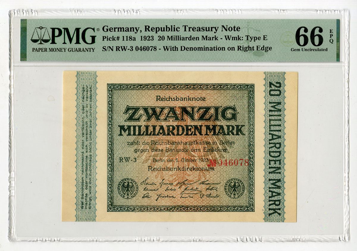 Germany, 1923. 20 Milliarden Mark, P-118a, Issued Banknote, Dark green on blue and orange underprint, Uniface Note, Denomination on right side, S/N RW-3 046078, Watermark Type E, PMG graded Gem Uncirculated 66 EPQ.