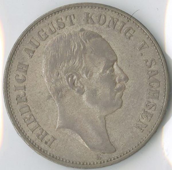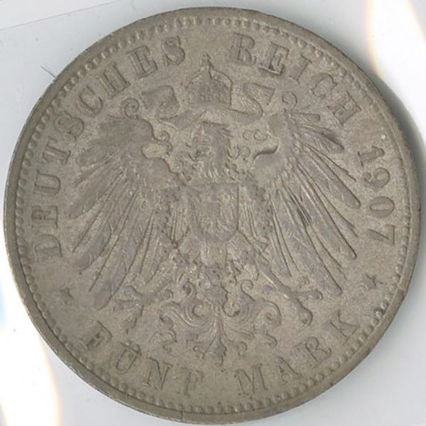 GermanyÉ... 1907E, 5 Mark, KM#1266, 0.900 Silver, 0.7986 oz., Obverse: Friedrich August III, Head right, Back Crowned Imperial Eagle Shield on breast, Choice VF - XF condition with a gray toning.
