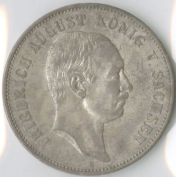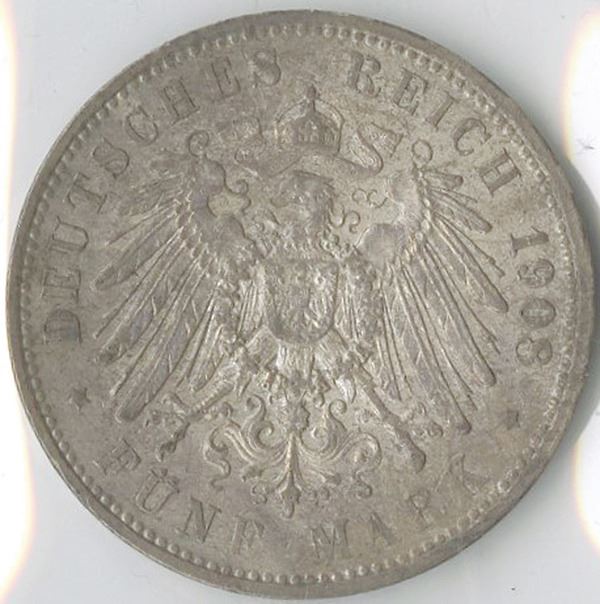 GermanyÉ... 1908E, 5 Mark, KM#1266, 0.900 Silver, 0.7986 oz., Obverse: Friedrich August III, Head right, Back Crowned Imperial Eagle Shield on breast, Choice VF condition with a gray toning.
