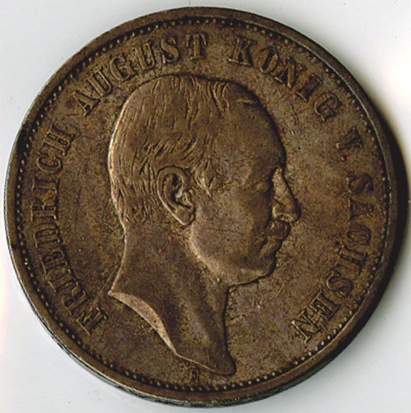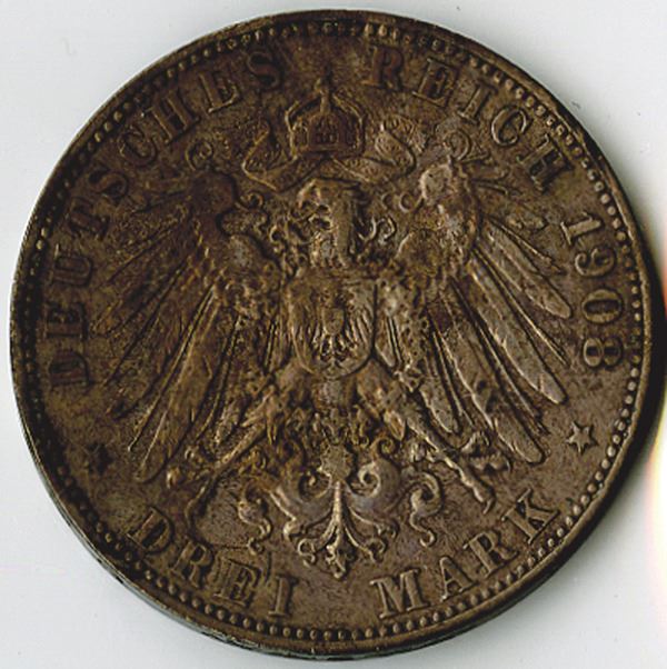 GermanyÉ.1908E, 3 Mark, KM#1267, 0.900 Silver, 0.4792 oz., Friedrich August III, VF condition with a gray toning.