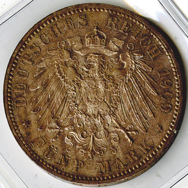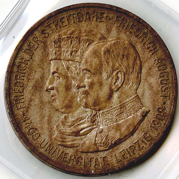 GermanyÉ.1909, 5 Mark, KM#1269 (Y#77), 0,900 Silver, 0.7986 oz., 500th Anniversary Leipzig University, Crown Prince Friedrich the Pugnacious and Friederich August III, XF to Almost Uncirculated with a cloudy gray iridescent color.