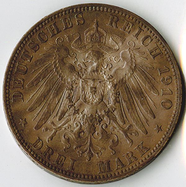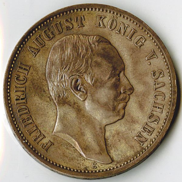 GermanyÉ.1910E, 3 Mark, KM#1267, 0.900 Silver, 0.4792 oz., Friedrich August III, XF to Choice XF condition with a gray iridescent color.