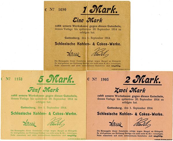 Germany, Gottesberg. 1914, Lot includes 1, 2, and 5 Mark, oval validation stamps on otherwise blank back. Very Fine.