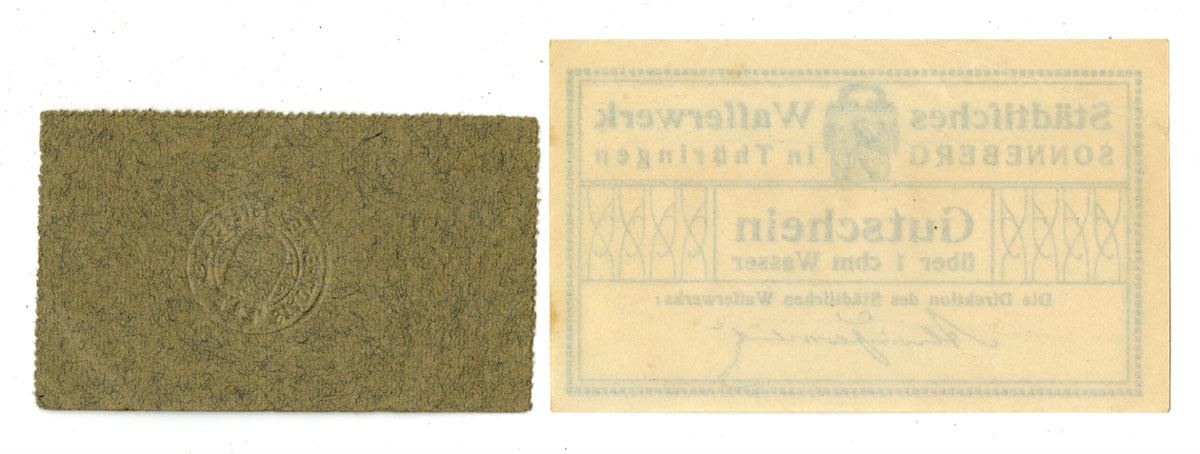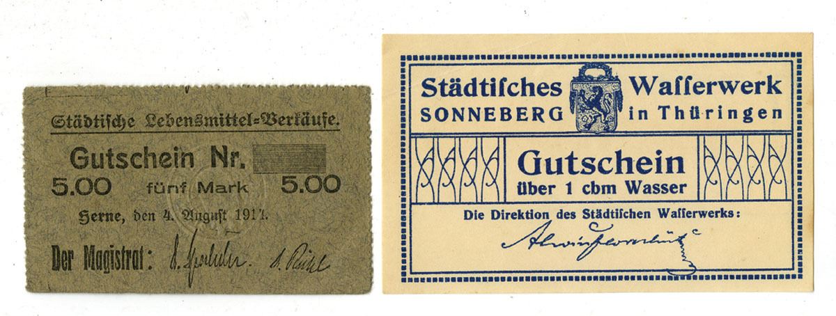 Sonneberg, Thuringia, & Herne, Westphalia, municipal service and ration vouchers issued during and shortly after World War I, comprising: (1) Sonneberg Städtisches Wasserwerk, undated ca. 1920s, voucher for 1 cubic meter of water (“Gutschein über 1 cbm Wasser”), blue municipal-style printing with the city crest and director’s signature; and (2) Herne Städtische Lebensmittel-Verkäufe, 5 Mark food-purchase voucher dated 4 August 1917, printed on wartime paper with magistrate signatures, used during WWI food_rationing. Both pieces represent early German municipal emergency paper, collected alongside Notgeld issues. Approximate collector value for the pair: $25–$40 depending on condition.