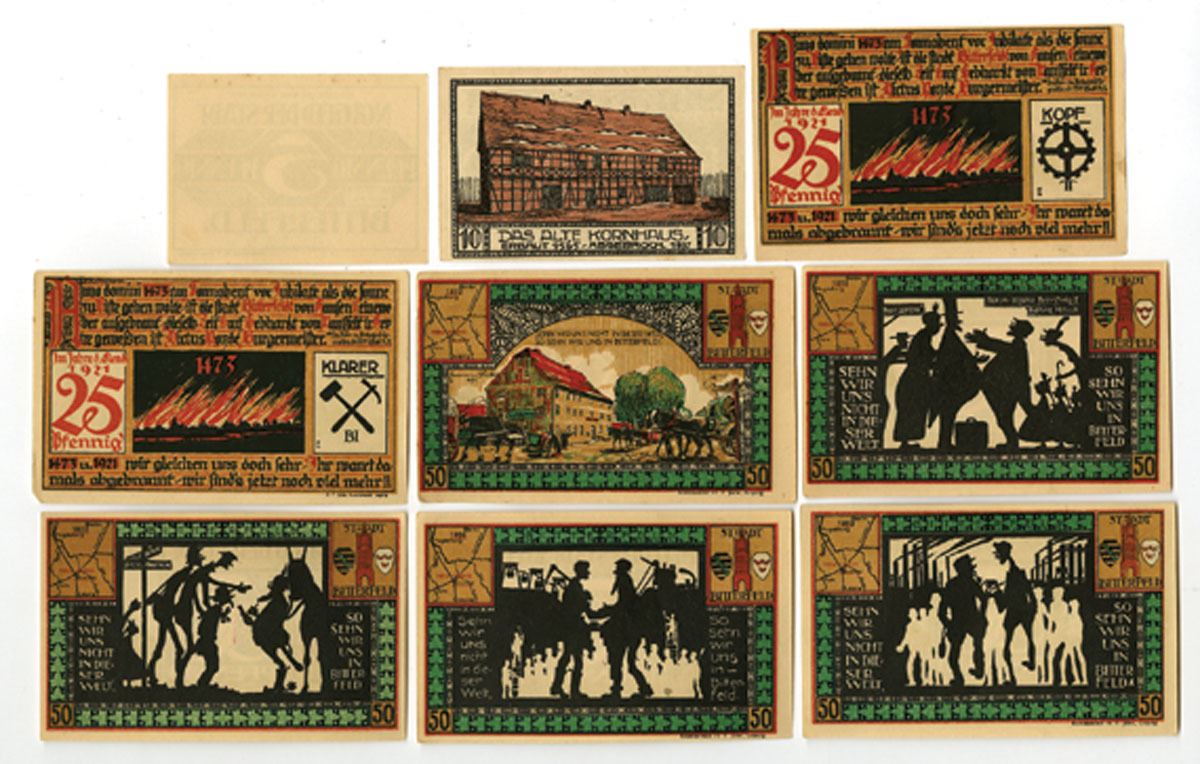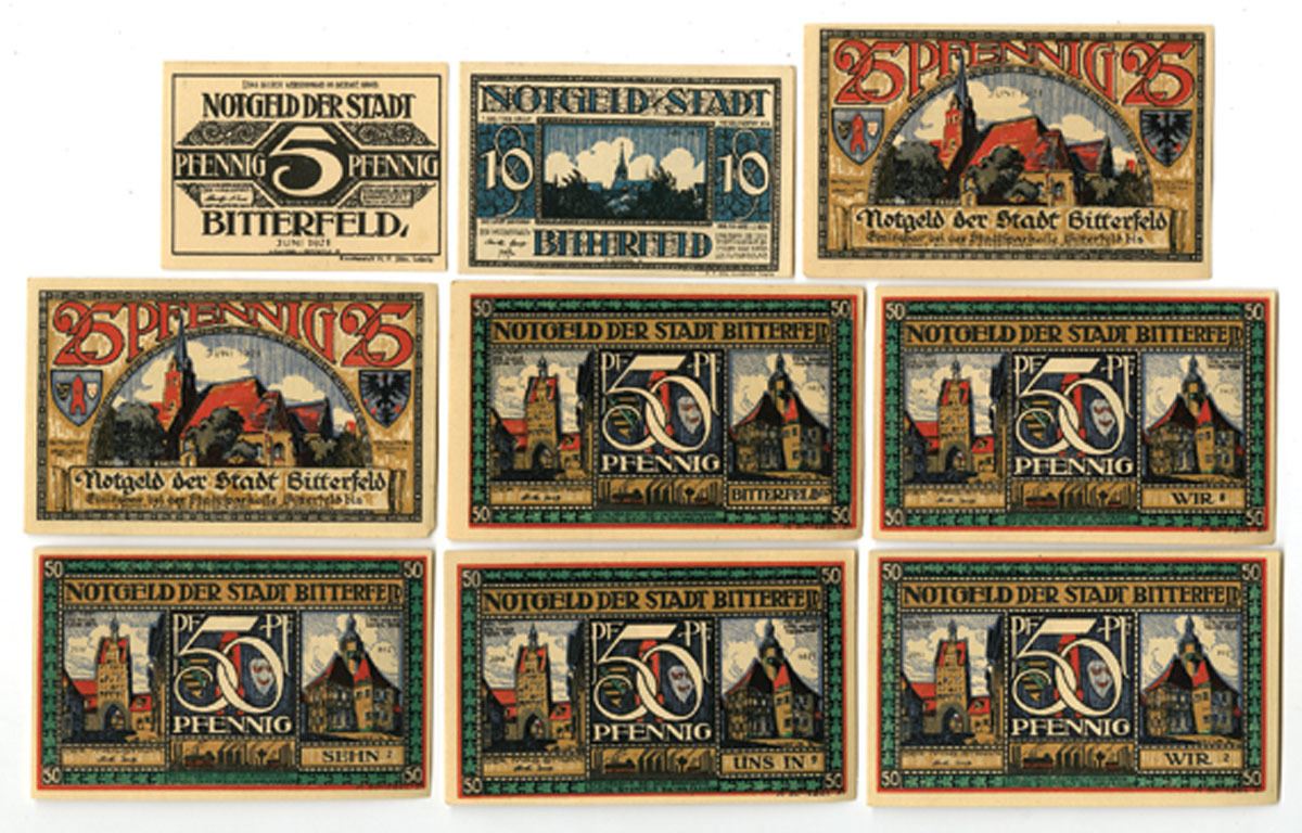 Bitterfeld, Germany, 1921. Lot of 9 Notgeld from Bitterfeld, Includes: 5 Pfenning, Black print; 10 Pfennig, Blue print; 25 Pfennig (2), Red and m/c print; 50 Pfennig (4), Red and green on m/c. Notes are in AU to UNC condition. (9). Sold "AS IS" no returns accepted.