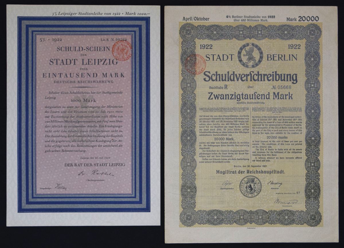 Germany, 1922. Lot of 2 I/U Bonds, Includes: Stadt Leipzig, 1000 Mark, 5%, I/U Bond, 1922, Bond, Black on pink underprint with blue and green border, Printed in German, S/N 00368; and, Stadt Berlin, 20,000 Mark, 4% I/U Coupon Bond, 1922, Dark green print on tan underprint with green border, Printed in German and English, S/N 05668. Both pieces are in VF-XF condition. (2). Sold "AS IS" no returns accepted